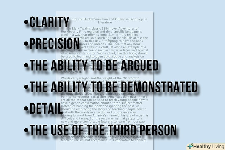 Визначитеся зі стилем написання твору.стиль письма важливий для написання хорошого есе. У більшості випадків він буде публіцистичним: нейтральний, інформативний і лаконічний. Якщо ви будете використовувати занадто експресивну лексику в спробі переконати всіх у правильності свого дослідження, воно не буде користуватися авторитетом. Якщо ж ви опуститеся до вживання сленгових виразів або розмовної мови, ваше дослідження не буде виглядати професійно. Але якщо ви пишете мемуари, ви можете використовувати більш неформальну лексику.- Стиль письма виражає ваше ставлення до предмету дослідження. Воно може бути скептичним, захопленим, трохи цинічним, підозрілим або нейтральним. Але незалежно від того, які емоції у вас викликає об'єкт досліджень, стиль письма повинен бути відповідним приводу написання твору.