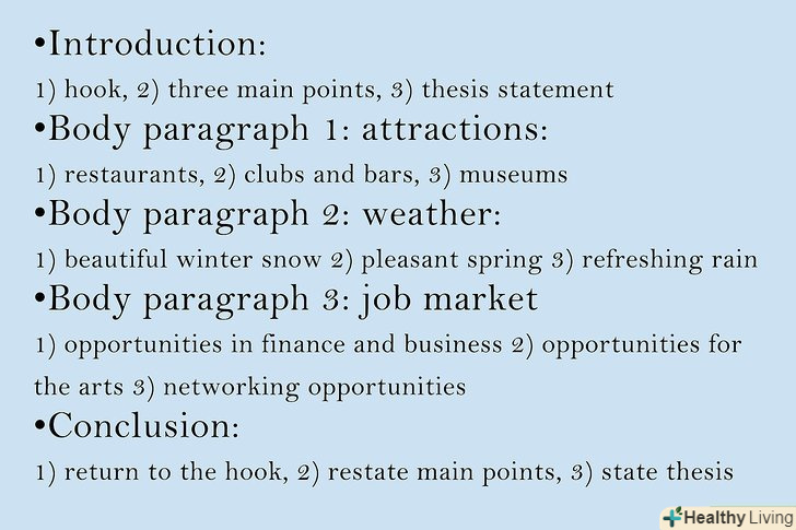 Продумайте структуру твору.після того, як ви накидали тези, продумайте канву, яка стане путівником по твору і допоможе вам свої думки в купу і розбити їх на абзаци. Це зробить роботу продуманою і логічною і дозволить вам не відхилятися від теми і не змінювати свою думку посеред тексту. План твору включає в себе вступну частину, основну частину і висновок. Ось приклад плану для твору на тему:»Москва - це найкраще місто для молодих фахівців завдяки його пам'яткам, клімату і ринку праці".- Вступ: 1) заголовок і вступна частина 2) три основні ідеї 3) теза