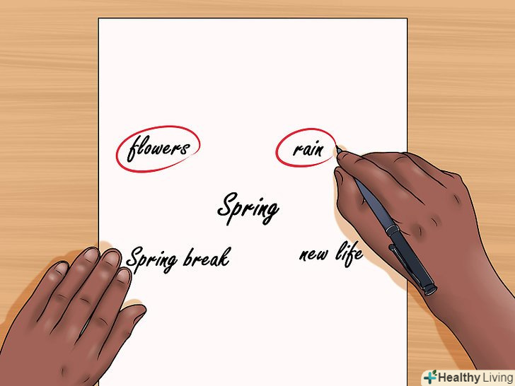 Придумайте "діаграму асоціацій". Візьміть певну тему або ідею і постарайтеся скласти групу слів і фраз, які асоціюються з цією темою.[9]- Візьміть аркуш паперу. У центрі напишіть основну тему, наприклад,»весна".