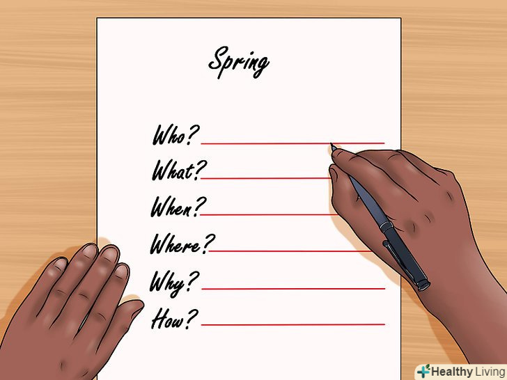 Тепер задайте собі шість важливих питань.візьміть новий аркуш паперу або створіть новий текстовий документ. Напишіть вгорі основну тему розповіді, а потім задайте 6 основних питань: "хто?", "що?", "коли?", "де?", "навіщо?", "як?"[13]- Дайте відповідь на кожне з цих питань, користуючись пропозиціями з написаного Вами тексту. Наприклад, якщо ви взяли тему «Весна», на питання " хто?"ви можете відповісти " ми з мамою". "Коли?– - "в один теплий травневий день, коли мені було шість років». "Де?– - "в саду за нашим старим будинком". "Чому?– - »тому що це був один з найщасливіших моментів у моєму житті". "Як?– - "в саду були тільки ми з мамою, сестри ще не прийшли зі школи».