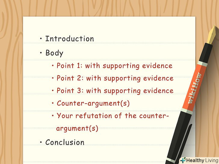 Створіть чітку тезову заяву для введення . воно буде найважливішою частиною вашої роботи, де ви коротко і дохідливо поясніть основні доводи, які збираєтеся привести по тексту статті. Оформіть тезову заяву одним або двома реченнями, а потім перейдіть до підготовки плану і тексту вашої роботи, щоб обґрунтувати своє твердження.[9]- Тезова заява повинна розташовуватися ближче до кінця введення і включати в себе короткий перерахування тих свідчень, які говорять на його підтримку.