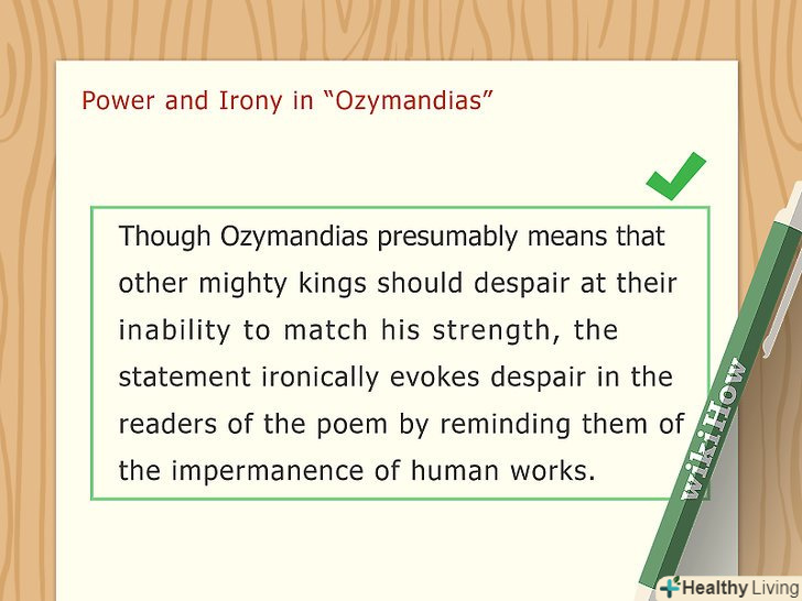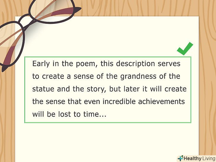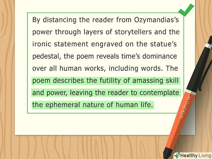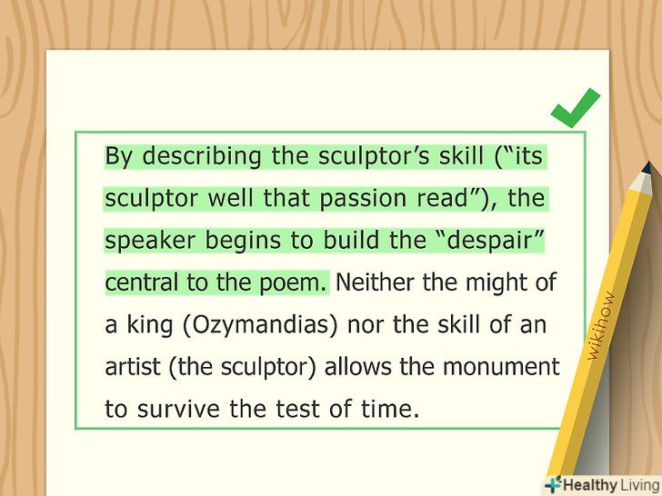 Доповніть кожне твердження прикладами, свідченнями та аналізом.недостатньо просто щось заявити. Щоб ваші твердження були переконливими, необхідно надати читачеві незаперечні докази і провести їх аналіз. У кожному абзаці основного тексту повинні бути присутніми тематичне речення (що містить основну думку), свідоцтва на його підтримку і аналіз свідоцтв, який пов'язує їх з тезовою заявою у вступі і з головною думкою самого абзацу.[12]- Наприклад: "Порівняйте алітерацію у фразі " тиха і тривожна трель", яка міститься в першій строфі" оди чубатої синиці", і фразу" м'яке і мелодійне нявкання "у другій строфі вірша" Сейді: кішка", яке Рудлз написала в 1904 році. З іншого боку, алітерації практично повністю відсутні в творах Реджинальда Хаффботтома того часу".