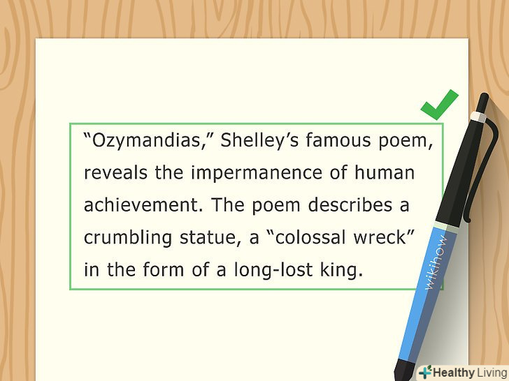Користуйтеся сполучними реченнями.ваша стаття не повинна бути обривистою і нескладною. Постарайтеся зробити так, щоб кожен черговий абзац плавно і логічно випливав з попереднього. Цього можна досягти за допомогою короткого сполучного речення на початку кожного абзацу, яке буде підводити нову тему до теми попереднього абзацу (або ж аналогічне речення можна розміщувати в кінці кожного абзацу).[14] ознайомтеся з прикладом сполучної пропозиції нижче.- " На додаток до алітерації, "Ода чубатої синиці" містить кілька прикладів синекдохи, ще одного стилістичного прийому, який зустрічається в деяких ранніх творах Рудлз".