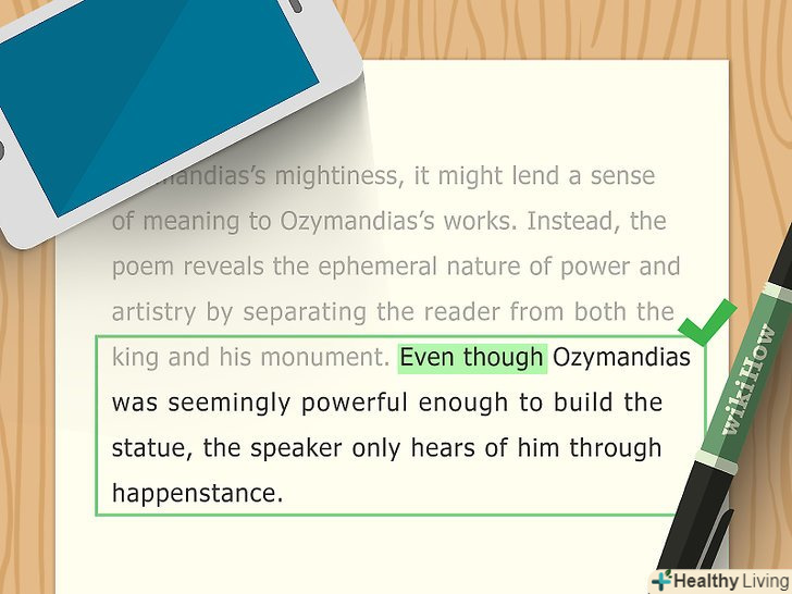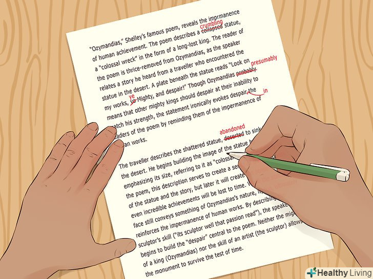 Перечитайте чернетку.під час читання звертайте увагу на явні недоліки стилю тексту, його послідовність і загальної організаційної структури. Якщо вам так буде простіше, перечитайте текст собі вголос. Відзначте все те, що ріже слух і потребує поліпшення. Коли будете читати, також постарайтеся відповісти на зазначені нижче питання.[21]- Лаконічний ваш текст? Чи немає в ньому слів і пропозицій, які можна просто викреслити?