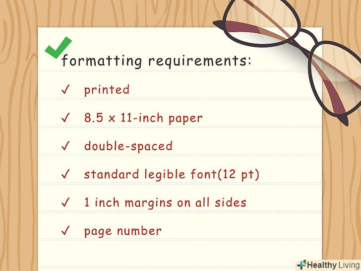 Зверніть увагу на вимоги до оформлення.вимоги до оформлення робіт у різних викладачів можуть відрізнятися. Тому перевірте своє завдання на предмет конкретних вимог до формату. Там можуть бути вказані такі параметри як міжрядковий інтервал, загальний обсяг роботи (в словах, сторінках або абзацах), розмір шрифту, нумерація сторінок, вимоги до титульного аркуша і підзаголовків розділів.- Якщо в тесті завдання немає ніяких вимог до формату, перевірте загальні вимоги до робіт з даного предмету або запитайте про це викладача.