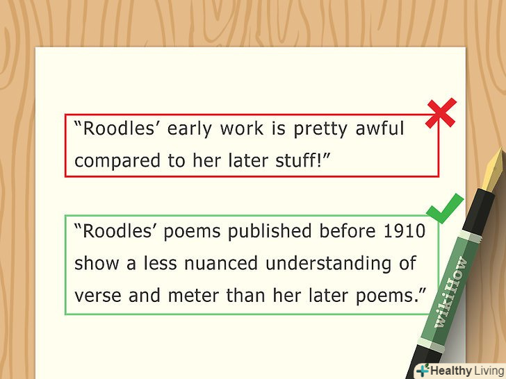Перевірте якість і стиль тексту.коли будете читати текст, подумайте, наскільки його стиль відповідає тій роботі, для якої він призначений. Уникайте сленгу і розмовних слів, різних кліше і зайвої емоційності або упередженості. У тесті слід дотримуватися офіційного стилю і об'єктивності.[22]- Наприклад, у вашій роботі буде недоречно використовувати пропозиції наступного виду “ " ранні твори Рудлз були просто жахливі в порівнянні з більш пізніми!”
