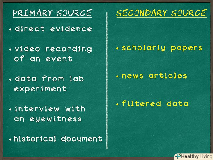 Якщо можливо, користуйтеся першоджерелами.першоджерела дозволяють отримати дані і прямі свідчення відразу з перших рук. Залежно від конкретної тематики, першоджерелом може бути відеозапис будь-якого заходу, дані лабораторного експерименту, інтерв'ю свідка події або історично задокументовані факти, включаючи пам'ятники, твори мистецтва і мемуари.[7]- Коли ви знайомитеся з вторинними джерелами інформації, такими як наукові записи або новинні статті, то перед вами постає картина, відфільтрована з точки зору когось ще. А пошук першоджерел дозволяє вам самостійно інтерпретувати інформацію.