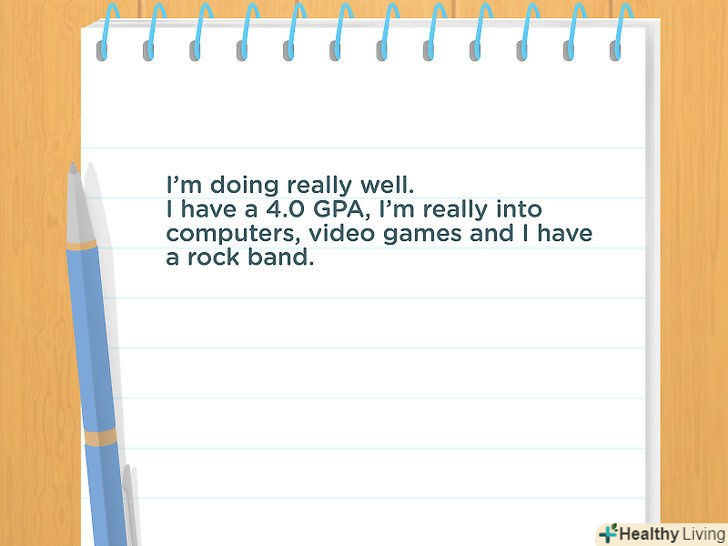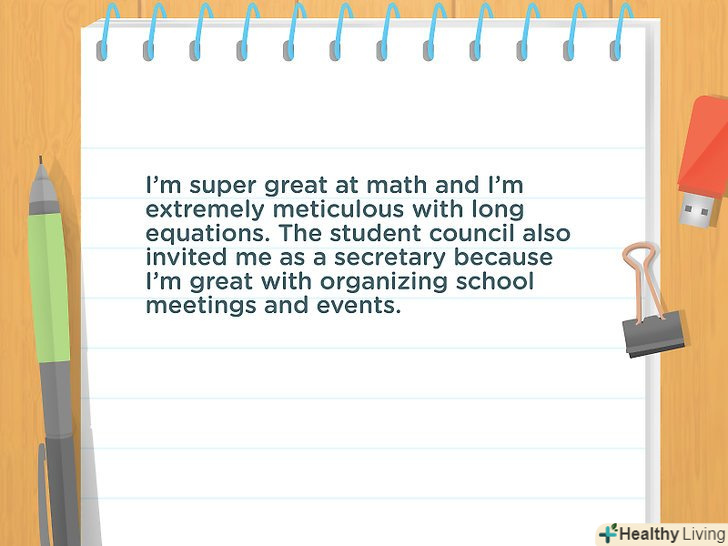 Опишіть свої навички та здібності.виберіть навички та здібності, які характеризують вас на даний момент (наприклад, теніс, здатність марширувати або писати нариси для шкільної газети). Можливо, ви добре розбираєтеся в літературі або математиці. Подібна інформація допоможе вам визначитися з цілями на майбутнє.[6]