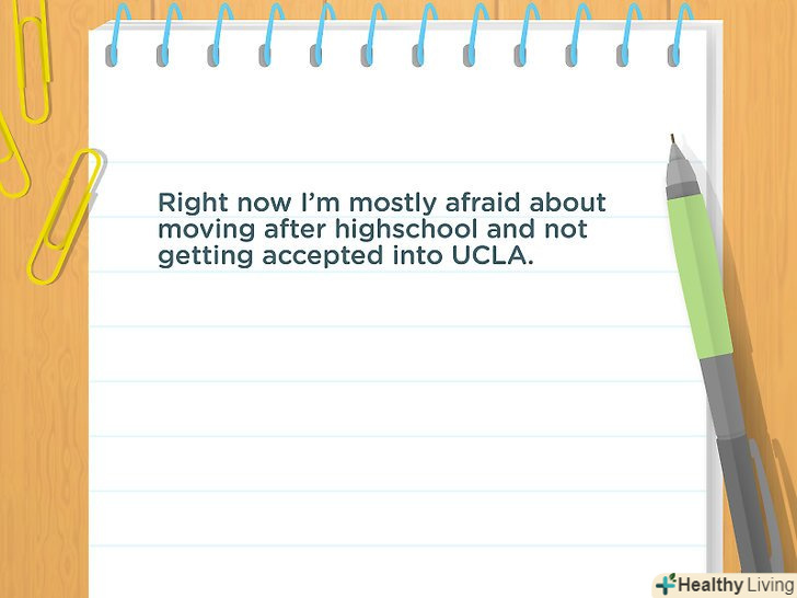 Опишіть свої страхи.розкажіть про свої страхи на кшталт боязні говорити на публіці, йти зі школи або провалити вступні іспити до університету. Через роки ви дізнаєтеся, наскільки ви впоралися з ними. Також можна прийти до висновку, що не варто так боятися, або розробити план, який дозволить позбутися від страхів.[4]