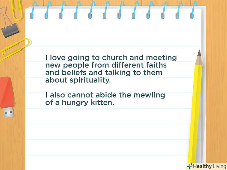 Вкажіть свої головні цінності і переконання.задумайтеся про те, що рухає вами зараз. Ваша система переконань (релігійних або цивільних) і особистий Етичний кодекс значно впливають на ваші вчинки. Розберіться в своїх цінностях, щоб скласти точне уявлення про те, ким ви хочете стати в майбутньому.[5]- Якщо ви релігійна людина, то вкажіть інформацію про церкву, або опишіть такі цінності, як здатність приймати різні прояви або відсутність віри. Назвіть моральні принципи, якими ви керуєтеся (творити добро або допомагати нужденним).