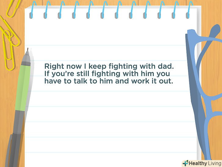 Дайте собі пораду.Подумайте про те, яку пораду можна дати самому собі в майбутньому. Ваша порада може бути простою або складною:" бути ввічливою з мамою"," вкласти кошти в акції"," ходити до церкви кожні вихідні"," менше хвилюватися через дрібниці"," серйозно ставитися до навчання "або"відкладати гроші на автомобіль". Визначте свої нинішні слабкі сторони, щоб Ваша порада на майбутнє виявилася корисною.[9]