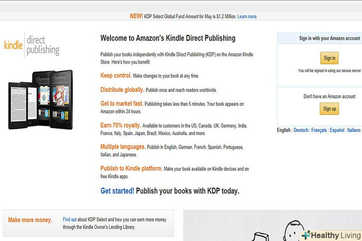 Видайте книгу через KDP.найчастіше використовують платформу від Amazon-KDP. З її допомогою ви відформатуєте і опублікуєте свою цифрову книгу спеціально для ринку Kindle. Інакше кажучи, всі власники цих читалок зможуть купити вашу книгу, від чого вам буде перераховано аж до 70% від вартості книги, якщо, звичайно, ціна знаходяться між 2.99$ і 9.99$. Головний мінус цього варіанту-ті, у кого немає читалок Kindle, купить вашу книгу не зможуть.