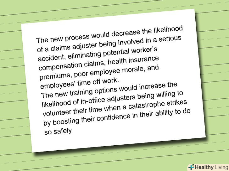 Почніть з впевненого вступу.в ідеалі, ви повинні зачарувати свого читача « " зловити його на гачок» з перших слів. Зробіть свою заявку максимально змістовною і корисною. Дайте читачам трохи довідкової інформації, щоб ввести їх в курс справи, а після цього викладіть суть своєї пропозиції.- Якщо ви маєте в своєму розпорядженні якимись незаперечними фактами, які можуть пояснити, чому питання вимагає якнайшвидшого вирішення-з них і слід почати. Що б це не було, завжди краще починати з констатації достовірного факту, а не висловлювання думок або припущень.