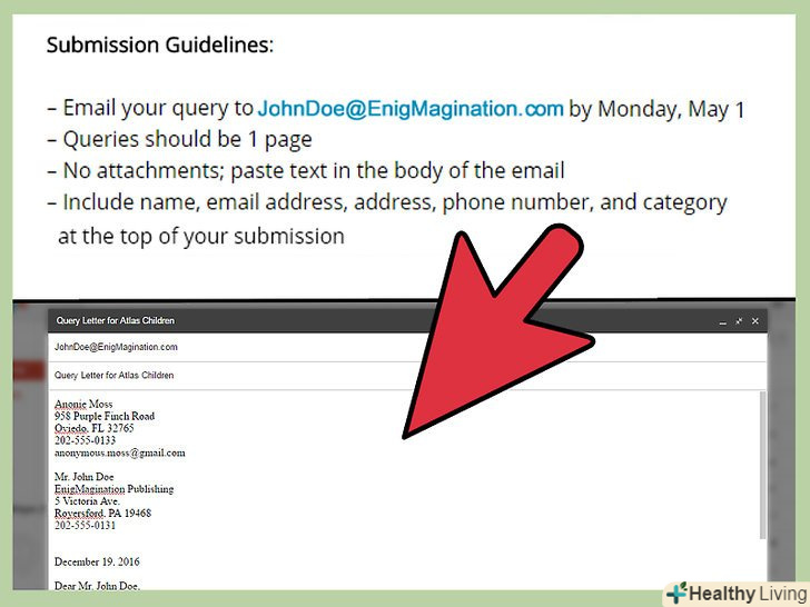 Дотримуйтесь правил подачі заявок.більшість видавництв вказують правила для авторів, які хочуть залишити заявку на публікацію.[11] необхідно точно дотримуватися таких правил, які можуть включати наступні аспекти:- Спосіб надсилання листа-заявки (електронний або звичайний лист);