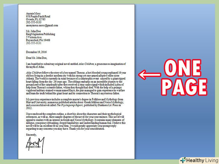 Вкажіть адресу відправника та одержувача у верхній частині сторінки.у самій верхній частині вам необхідно написати своє ім'я та прізвище, два наступні рядки повинен займати вашу адресу, а ще один рядок — номер телефону. У завершальному рядку вкажіть свою адресу електронної пошти.[1]- Пропустіть один рядок, після чого вкажіть ім'я агента, назву видавництва або агентства, адресу та контактну інформацію.