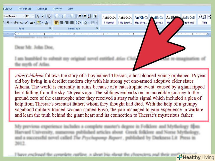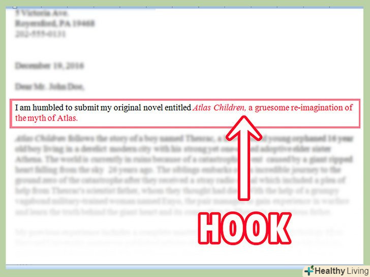 Надайте короткий зміст книги.після інтригуючого речення присвятіть абзац трохи більш докладному опису сюжету. Напишіть захоплюючу анотацію, щоб агент захотів прочитати книгу.[7]- Повідомте про важливих дійових осіб;