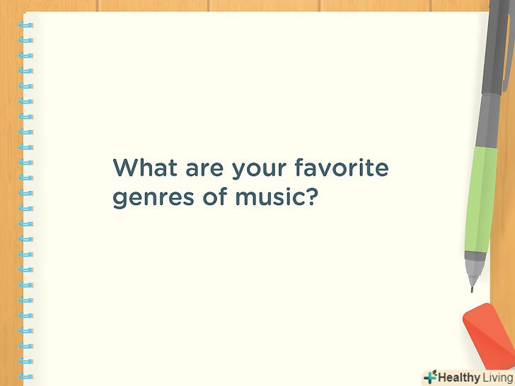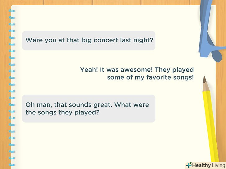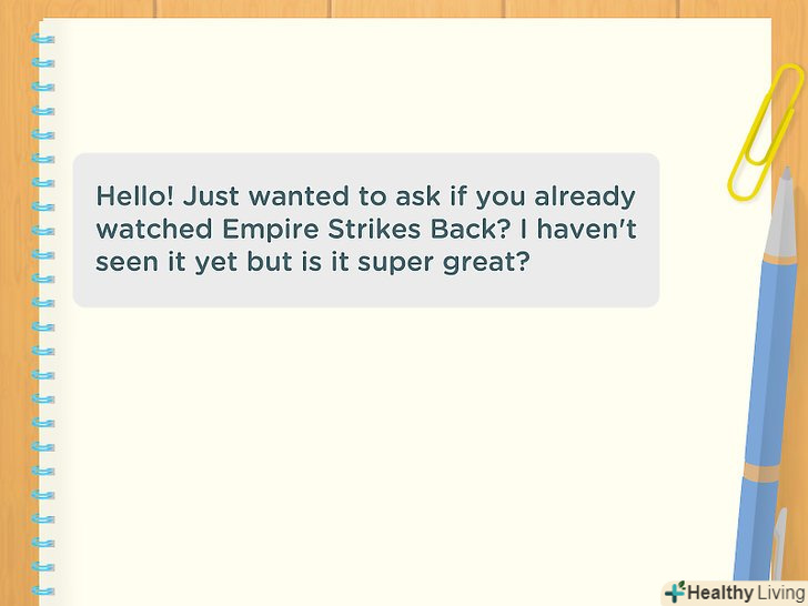Задавайте питання, що вимагають докладної відповіді.листуючись з людиною, спілкування з яким приносить вам задоволення, намагайтеся підтримувати розмову якомога довше. Задавайте питання, відповіді на які будуть не просто "так" або "ні", а які послужать основою для продовження розмови.- Наприклад, замість того, щоб запитати: "тобі подобається поп-музика?", запитайте: "який жанр музики тобі подобається?"Постарайтеся показати співрозмовнику зацікавленість і бажання продовжити обговорення теми.
