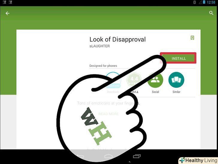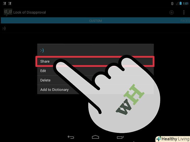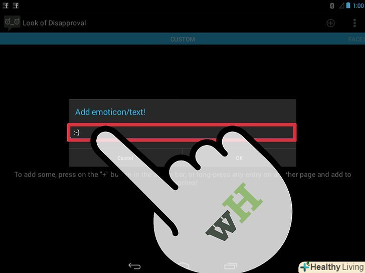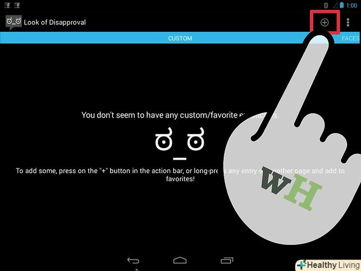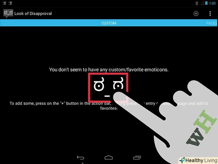Скачайте додаток»Look of Disapproval". це безкоштовний додаток, що дозволяє швидко скопіювати безліч смайликів в буфер обміну Android, щоб вставляти їх в текстовому полі. Ви також можете додавати власні смайлики.- Завантажити цю програму можна з Google Play Store.