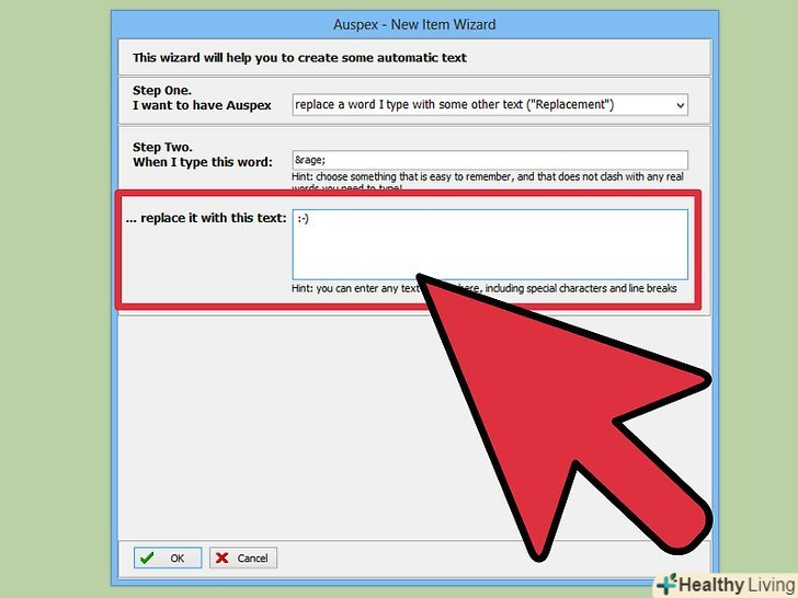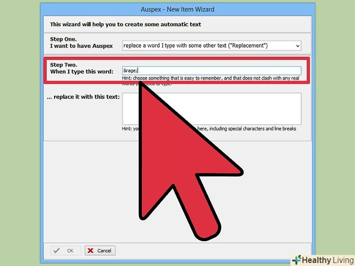 У полі «Step Two» (Крок другий) введіть команду.в якості команд не вводите звичайні слова, так як вони будуть змінюватися на смайлики.- Вводите команди в HTML-стилі. Наприклад, якщо ви створюєте команду для смайлика(ಠ益ಠ), як команди введіть amp;rage;, де символи amp; і ; перешкоджатимуть заміні слова» rage " на смайлик.