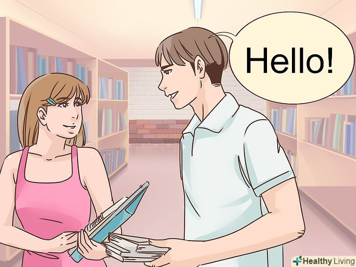 Посміхніться. Це відмінний спосіб здатися більш відкритою людиною. Коли ви йдете по шкільних коридорах, не опускайте погляд і не дивіться в книжку. Тримайте голову прямо і зустрічайтеся поглядом з іншими людьми. Якщо ви побачите знайомих, привітайтеся або посміхніться.[5]