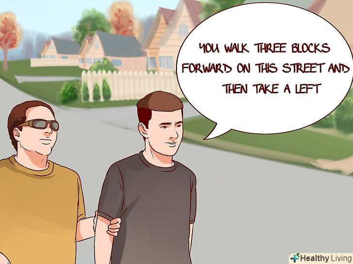 Вказуйте напрямок вголос.часто люди використовують для цього невербальні підказки або знаки (наприклад, показують пальцем). Іноді це наскільки машинально, що ми просто не усвідомлюємо — адже людина нічого не бачить. Необхідно запам'ятати, що незрячим людям завжди потрібно повідомляти напрямок вголос. Говоріть:»потрібно пройти три квартали прямо по цій вулиці, а потім повернути ліворуч". Не потрібно показувати рукою і говорити:»пройдіть три квартали в цю сторону".