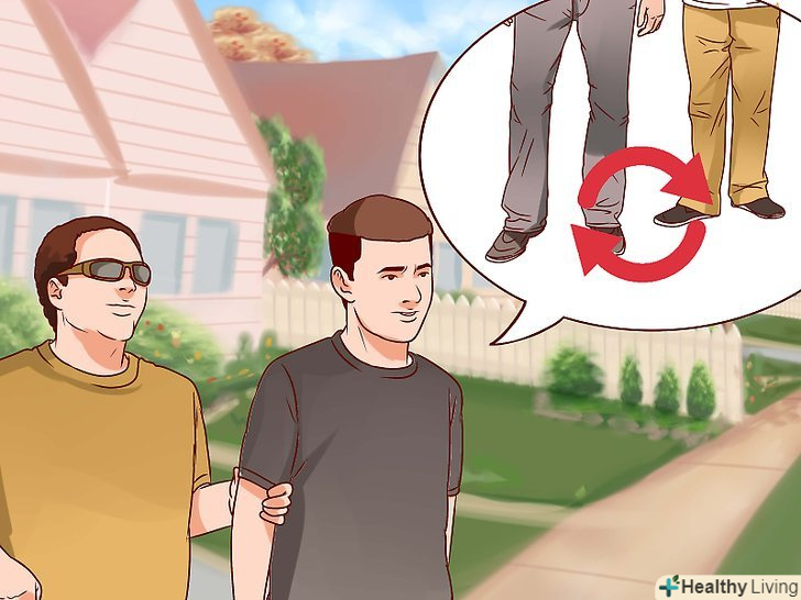 Сліпий рухається на півкроку позаду.незряча людина йде трохи ліворуч або праворуч від вас. Швидкість руху повинна бути зручною для вас обох. Періодично цікавтеся, наскільки людині комфортно рухатися в такому темпі.[2]- Звертайте увагу на перешкоди. Обов'язково дивіться під ноги, по сторонам і на рівні голови. Говоріть сліпому, коли потрібно відійти в бік або пригнутися.[3]