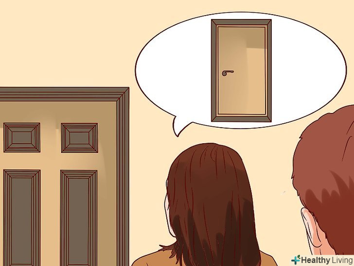Двері та дверні прорізи.періодично потрібно пройти з незрячою людиною в двері. У цій ситуації необхідно вжити заходів обережності, щоб уникнути непотрібних проблем.- Переконайтеся, що незряча людина знаходиться з боку петель. Якщо необхідно помінятися місцями, то дотримуйтесь вказівок вище.[10]