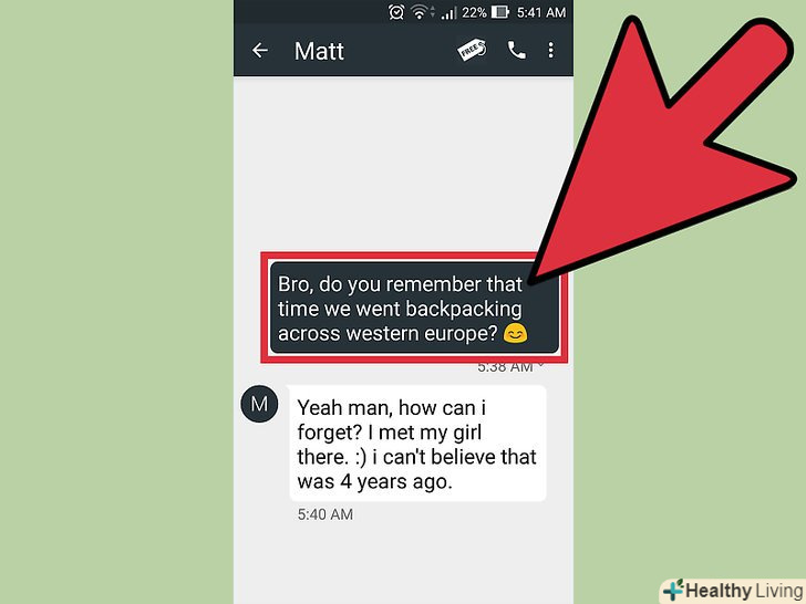 Віддавайтеся спогадам.у листуванні зі старим другом завжди можна згадати минуле і посміятися або поностальгувати разом. Слова на кшталт: "А пам'ятаєш, як...",- або: "я сумую за тими часи, коли...",- завжди будуть до місця. Головне, щоб ваше зауваження не викликало надмірно гостре почуття ностальгії, яке завадить продовжити бесіду.- Такі випадкові спогади можуть приходити в голову не тільки посеред розмови. Якщо ви хочете почати розмову зі старим другом, з яким давно не спілкувалися, то напишіть йому щось на зразок: «Пам'ятаєш, коли ми з тобою...».