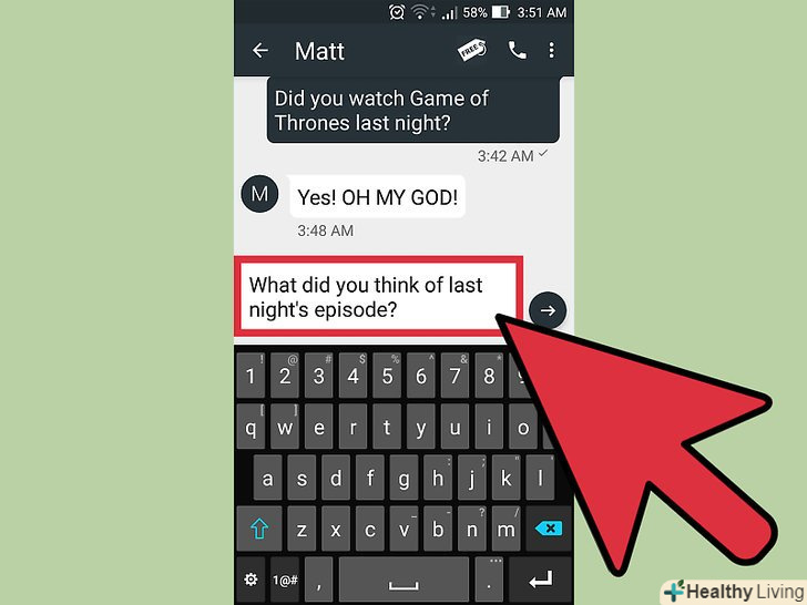 Почніть з простої теми.не потрібно винаходити велосипед. Запитайте, чи дивився ваш друг нову серію вашого улюбленого серіалу або чим він займався на вихідних, щоб почати розмову. Коли у співрозмовників є тема, яка цікава їм обом (спорт, телебачення, швидкі вибори), у них з'являється відмінний привід поговорити.- Не намагайтеся вибрати найкращу тему. Якщо ваш варіант виявиться не найцікавішим, то завжди можна обговорити щось інше. У листуванні підтримувати органічну бесіду трохи простіше, ніж по телефону або при особистій зустрічі.