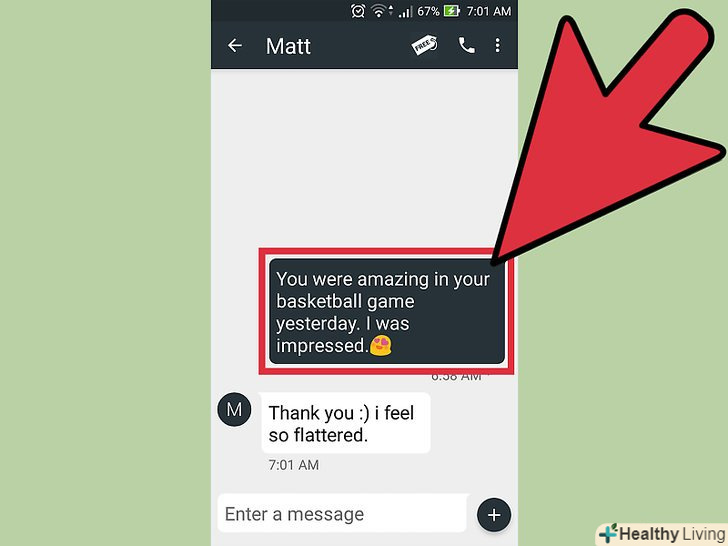 Зробіть комплімент.компліменти завжди в ціні, притому вам необов'язково бути віч-на-віч з людиною, щоб сказати щось приємне. Вдалий комплімент-хороший спосіб почати розмову і показати своє розташування. Якщо бути щирим і не ставити людину в незручне становище, то комплімент буде доречний навіть в СМС. Кілька прикладів:- " ти вчора провів відмінний матч. Я під враженням"»