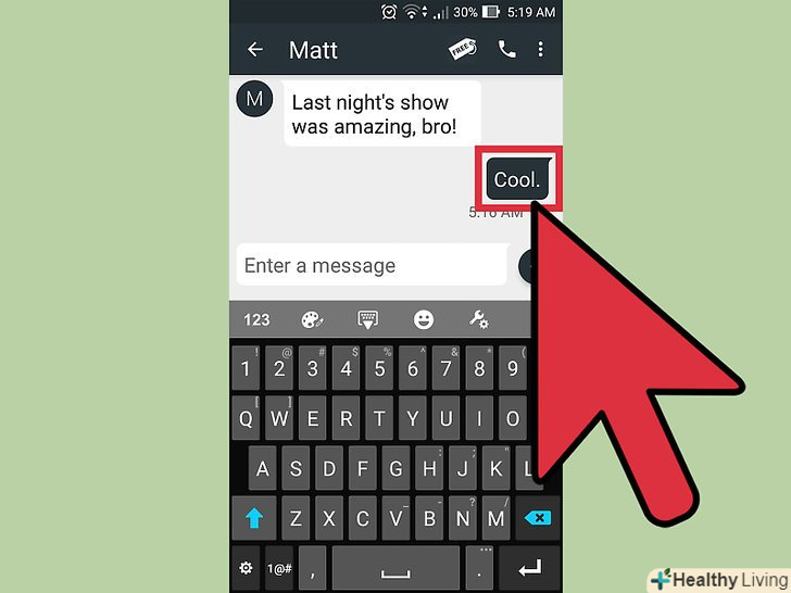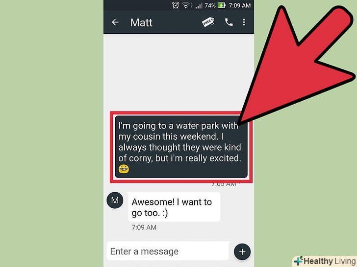 Не думайте над повідомленнями занадто багато.при листуванні важливо пам'ятати про те, що спілкування не повинно тиснути на вас. Не потрібно придумувати ідеальну першу репліку або найсмішнішу в світі жарт. Якщо надмірно обмірковувати кожне слово, то розмова сповільниться, а співрозмовник може подумати, що ви зайняті або втратили інтерес, хоча ви просто задумалися на відповідною відповіддю.- Природний хід неідеальної бесіди завжди краще, ніж десятихвилинні роздуми над подальшими репліками в спробі розповісти саму захоплюючу історію. До того ж, ваш співрозмовник може взятися за термінову справу, а ви втратите можливість поговорити з ним.