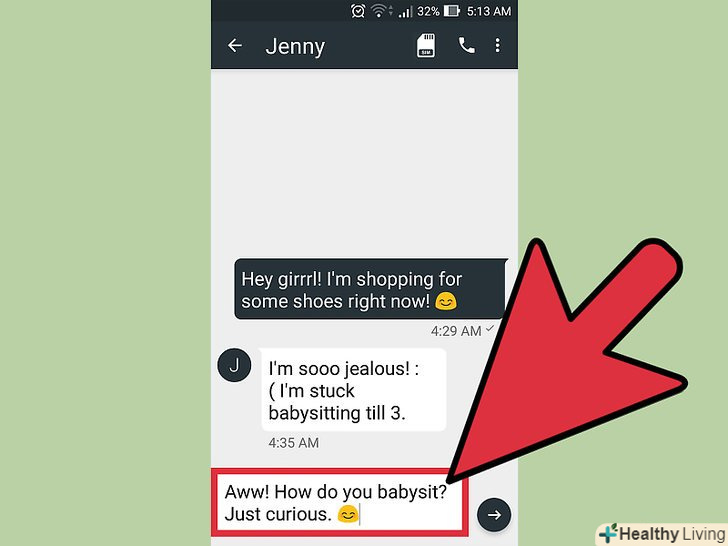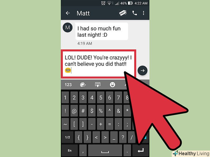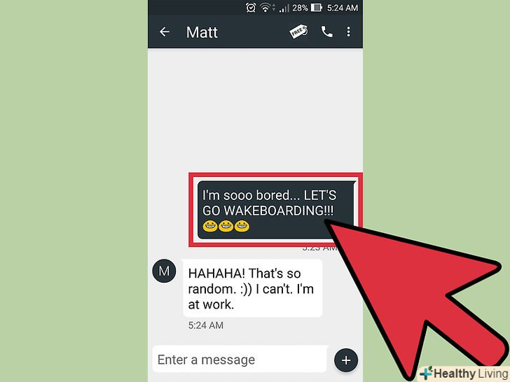 Пишіть веселі і життєрадісні повідомлення.навіть якщо вам нудно, то співрозмовнику зовсім не обов'язково знати про це. Якщо постійно скаржитися на нудьгу, то співрозмовник може втратити інтерес і перестати відповідати на повідомлення, так як вважатиме, що вам з ним нудно. Замість цього зосередьтеся на позитивних аспектах і проявляйте ентузіазм щодо теми вашої бесіди.- Не використовуйте ті самі слова. Складно побудувати цікаву бесіду, якщо завжди отримувати однакові монотонні відповіді на кшталт «Ха-ха», «Ага», «Вау», «Ох». Проявіть краплю фантазії, щоб показати співрозмовнику свій інтерес. Так ваша розмова буде більш змістовним і живим.