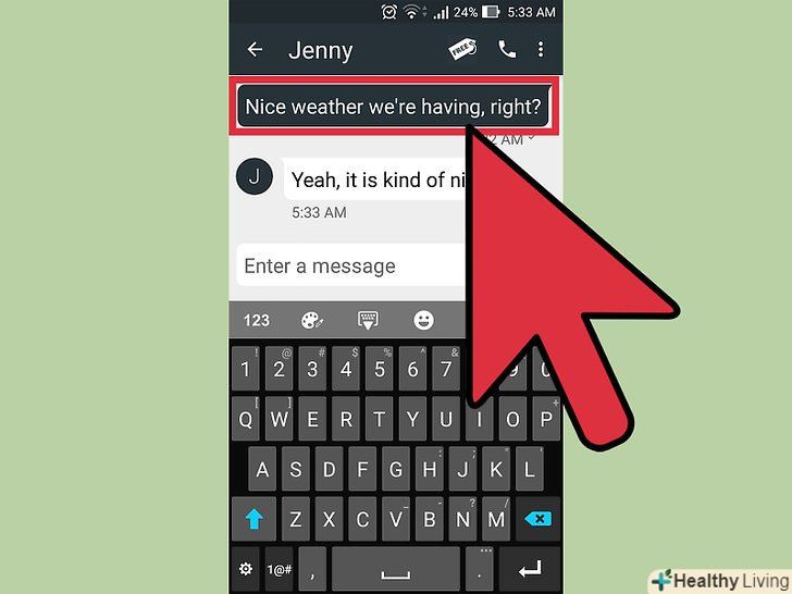 Не ведіть нудних, клішованих, буденних бесід.звичні розмови про погоду прийдуть на допомогу тільки в крайньому випадку, але вони рідко перетворюються в запам'ятовуються бесіди. Замість слів:» хороша погодка на вулиці", — краще придумати щось оригінальне. Це особливо важливо при спробах розташувати до себе нового друга або потенційну другу половинку. Не пишіть того, що вони чули від десятків інших людей.- Також не пишіть занадто прості повідомлення на кшталт «Як справи?", "Ну і день сьогодні«, - або:»я так втомилася". Людині потрібно більше інформації, якщо ви хочете нормально поговорити.