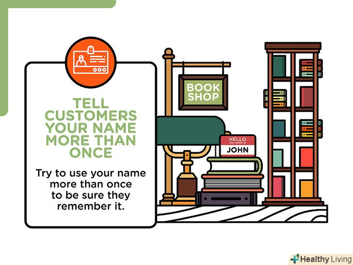 Повторіть клієнту своє ім'я кілька разів.покупці повинні знати ваше ім'я, якщо їм потрібна Ваша допомога. Крім того, представившись, ви стаєте в очах покупця не просто безликим співробітником магазину, а людиною, з яким вони можуть відчути себе більш комфортно.[14] тому спробуйте повторити своє ім'я кілька разів, щоб покупець точно його запам'ятав.