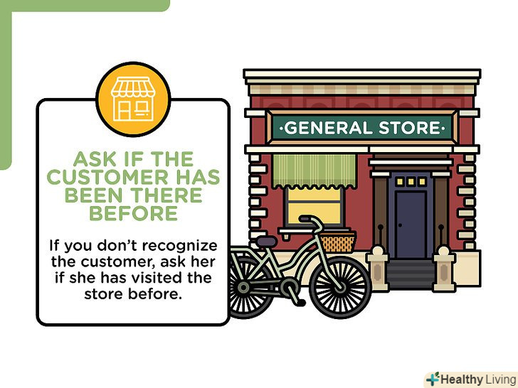 Запитайте, чи був Покупець у цьому магазині раніше.якщо ви не впізнаєте клієнта, запитайте його, чи вперше він тут. Дослідження показали, що таке привітання збільшує число продажів на 16 %.[17]- Якщо покупець вже був у вашому магазині, поцікавтеся, що він купив, чи сподобався йому товар. Так, у покупця не тільки залишиться гарне враження, але і він звернеться до вас, якщо йому буде щось потрібно.