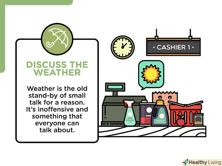 Обговоріть погоду.починати розмову з обговорення погоди-стара традиція. Це абсолютно нейтральна тема, яку може підтримати кожен. Обов'язково вислухайте співрозмовника і дайте відповідь відповідним чином. Ключ невимушеної бесіди полягає в тому, щоб клієнт відчув себе невимушено, адже це привертає до покупки.[18]