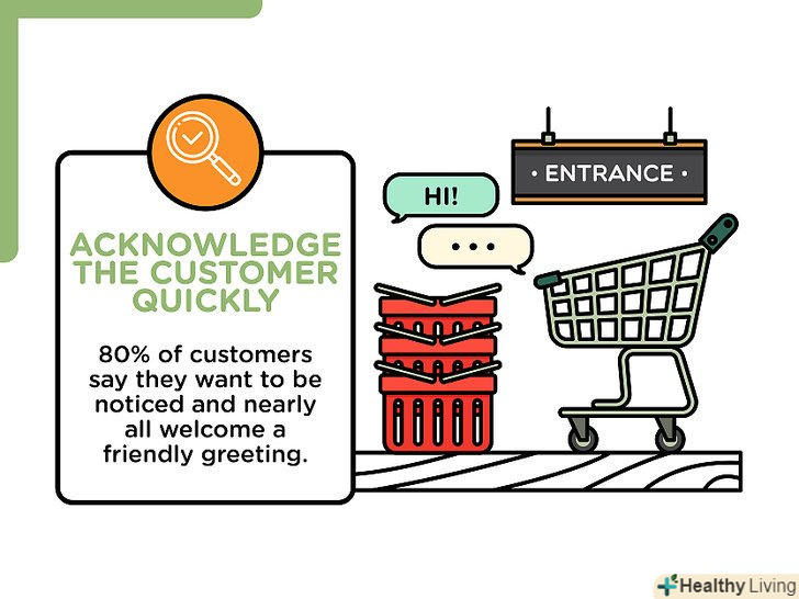 Намагайтеся якомога швидше помітити і привітати клієнта. 80 % покупців стверджує, що вони хочуть, щоб консультанти їх помічали, і майже всі схвалюють дружнє вітання.[4] не обов'язково вголос вітати кожного покупця, але можна кивнути клієнту, подивитися йому в очі і посміхнутися.[5]- Якщо ви розставляєте товар по полицях або працюєте на складі, перервіться і привітайте покупця. Принаймні, скажіть, що скоро підійдете і Запропонуйте свою допомогу. Опитування показують, що покупцям подобається, що спочатку продавці їх вітають, а потім займаються своїми справами.[6]