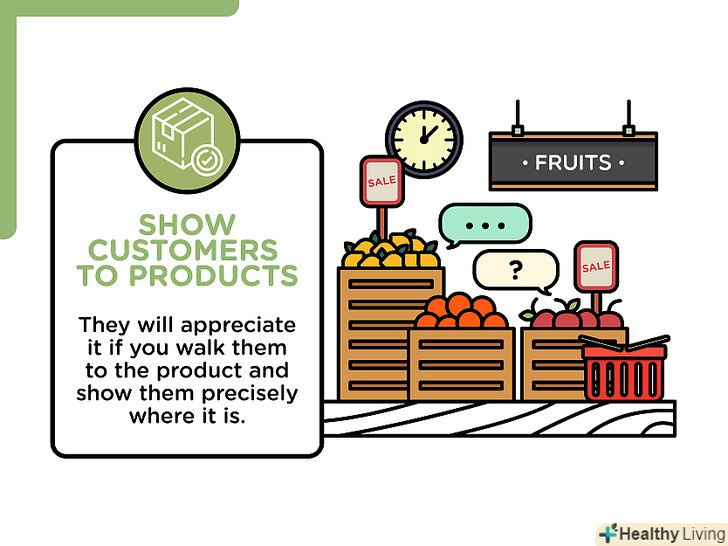 Покажіть покупцям продукти.потрібно не просто сказати, де лежить товар, який шукає клієнт, а показати його. Покупець оцінить цей знак уваги, якщо ви разом з ним пройдете до товару і покажете його.[9]