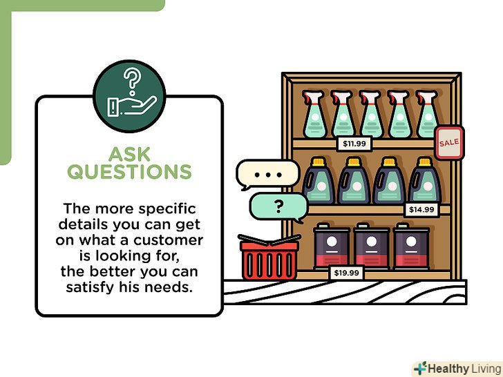 Задавайте питання.чим більше подробиць ви дізнаєтеся про те, що шукає покупець, тим краще зможете задовольнити його потребу. Якщо ви працюєте в магазині харчування, і клієнт шукає протеїновий порошок, запитаєте, для якої мети: чи намагається він схуднути, накачати м'язи або привести їх в тонус. Йому потрібен продукт для тренувань або для запобігання голоду? Якщо клієнт шукає шорти в магазині одягу, запитайте його про те, який матеріал, колір і фасон він вважає за краще. Ставлячи питання, ви показуєте покупцеві, що дбаєте про його потреби.[10]