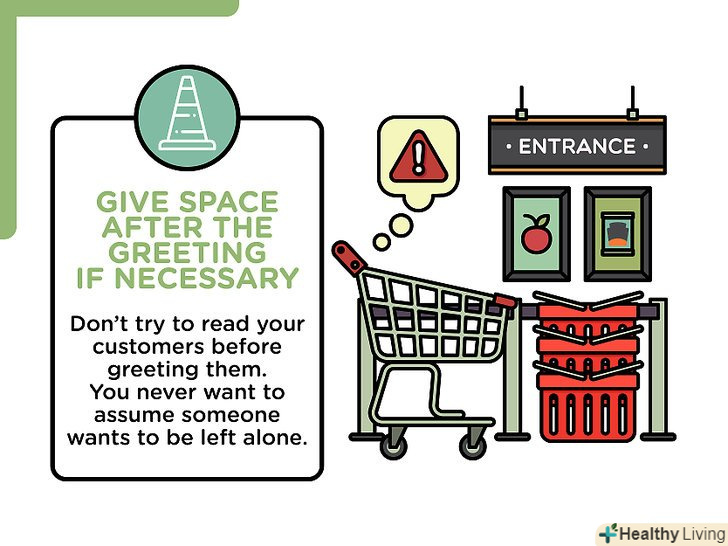 Після того, як привітали клієнта, дайте йому можливість якийсь час самостійно погуляти по магазину.не намагайтеся прочитати думки покупця ще до того, як привітаєтеся з ним. Ви ж не хочете, щоб клієнт мріяв, щоб ви відстали від нього. Дружелюбно привітайте клієнта, але якщо він відповідає холодно або зовсім не відповідає, скажіть покупцеві, що ви поруч, якщо йому знадобиться допомога, і залиште клієнта, зайнявшись своїми справами.[11]