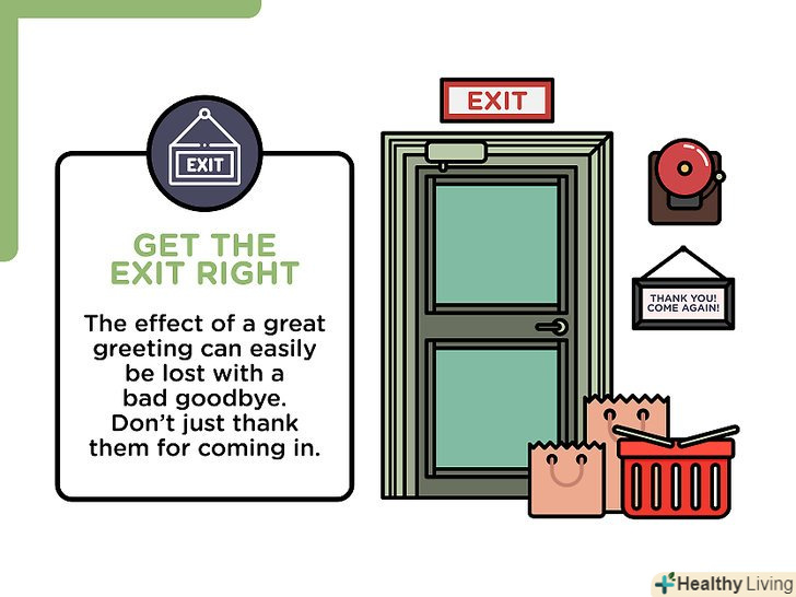 Правильно Попрощайтеся.Хороший ефект від правильного привітання може швидко стертися з пам'яті, якщо неправильно попрощатися з покупцем. Потрібно не просто подякувати клієнту за те, що він зайшов у ваш магазин, потрібно проводити покупця до дверей і відкрити для нього двері. Якщо людині потрібна допомога (наприклад, літній людині, вагітній жінці, батькам з дітьми), запитайте, чи допомогти йому/їм донести покупки до машини.[12]