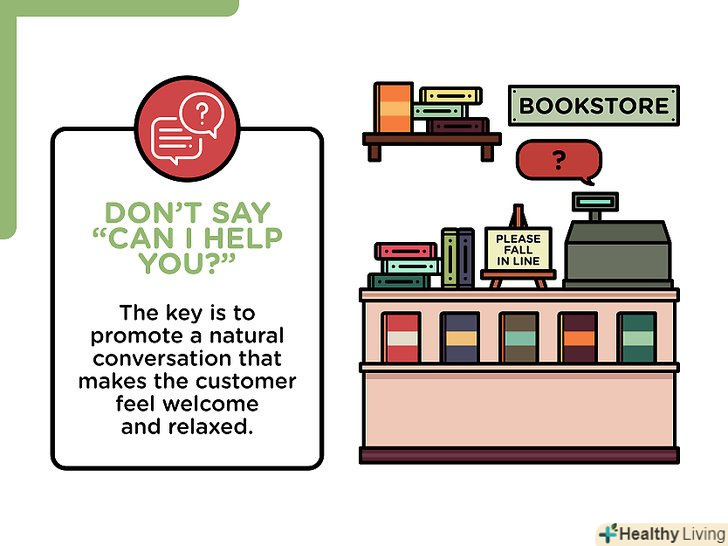 Не вимовляйте фразу: «Чи можу я вам допомогти?"Це стандартне привітання, яке не працює. Зазвичай у відповідь на цю фразу Ми чуємо: «Ні, я просто дивлюся». І наша наступна фраза звучить так:»добре, дивіться". Не починайте з банальної фрази! Ключ в тому, щоб завести природну розмову, при якому клієнт відчує вашу привітність і розслабиться.[13]