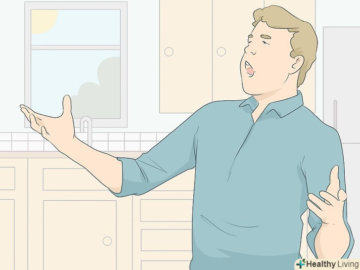 Почніть з вправ на дихання.дихальні вправи дозволять вам краще контролювати висоту і тривалість вашого співу. Тут немає нічого дивного: співаки, які в змозі дихати глибоко і без перебоїв, можуть використовувати свій голос набагато ефективніше.- Практикуйтеся відкривати горло. Розслабтеся і розкрийте щелепи, приблизно як риба, витягнута з води. Тим часом, почніть потроху напружувати м'язи обличчя.
