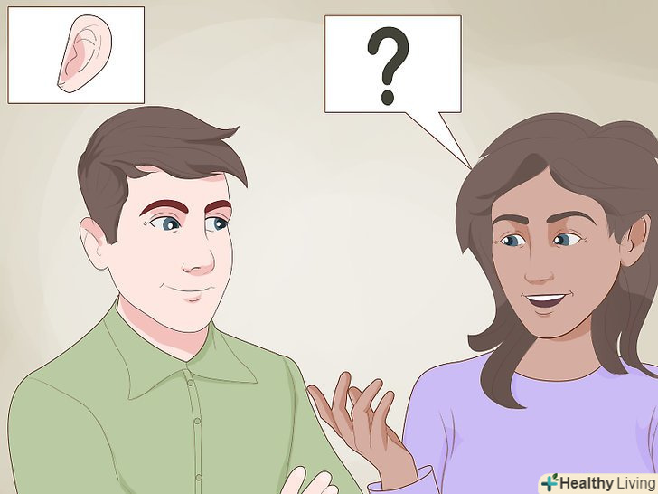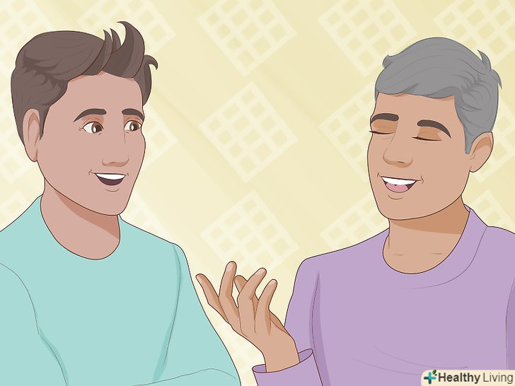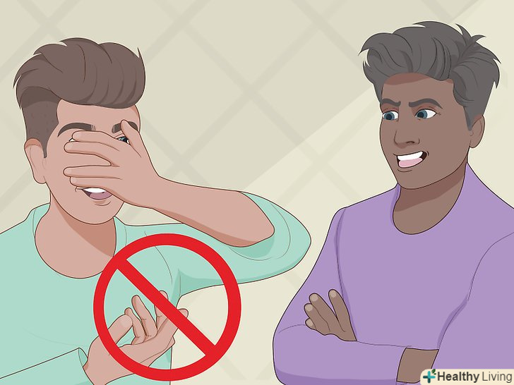 Використовуйте дружню мову жестів.чемно посміхайтеся, коли звертайтесь до когось. Помірно жестикулюйте, кивайте головою, щоб показати свою зацікавленість.- Намагайтеся не показувати, що нервуєте, не варто переходити з однієї ноги на іншу або нервово смикати пальцями. Якщо ви не можете позбутися від звички ворушити пальцями, постарайтеся зробити це якомога більш непомітно. Наприклад, ви можете ворушити пальцями ніг в туфлях.