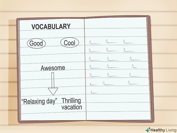 Використовуйте особливу лексику.звичайно, ніхто не просить вас використовувати слова, значення яких відомо лише одному з десяти чоловік. Просто постарайтеся урізноманітнити свій словниковий запас, включити у вживання нові терміни. Ось кілька прикладів:- Замість слів «добре», «класно» або «чудово» спробуйте описати ситуацію більш детально, використовуйте точні терміни. Розкажіть про "вихідний день», «захоплюючий відпочинок», "доброзичливому і працьовиту людину".