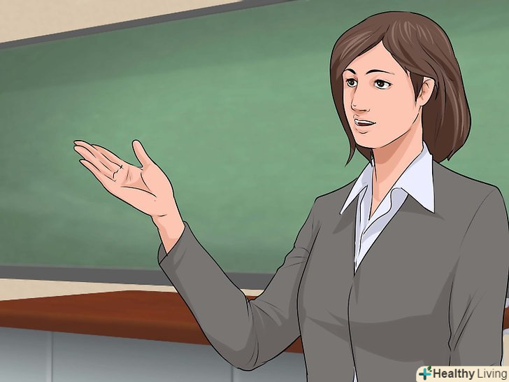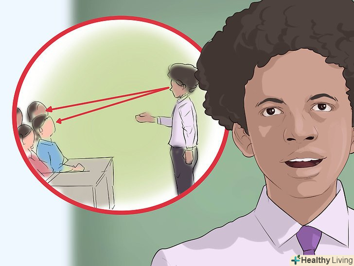 Підтримуйте постійний зоровий контакт.в процесі виступу оглядайте аудиторію і намагайтеся поглянути на кожного слухача. Якщо ви зловите себе на тому, що дивитеся в одну частину приміщення, змусьте себе перевести погляд. Не намагайтеся просто зосередитися на слухачах, які сидять на останніх рядах, подивіться людям в очі, щоб зрозуміти їх реакцію на вашу мову.[13]