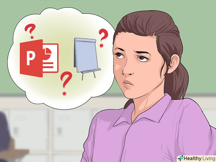 Подумайте, якими технологіями ви будете користуватися, а також що вам потрібно принести.переконайтеся в тому, що спокійно зможете користуватися необхідним обладнанням. Це означає, що, можливо, вам доведеться добре володіти такими програмами, як Power Point. Або, можливо, варто потренуватися налаштовувати автоматичне перемикання слайдів (або скористатися чиєюсь допомогою). Якщо ви плануєте користуватися мікрофоном, навчитеся його налаштовувати.[4]- Наприклад, якщо ви плануєте показувати презентацію зі слайдів, важливо переконатися в тому, що приміщення обладнано проектором.