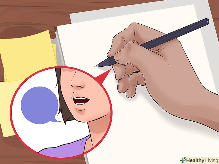 Говоріть чітко і впевнено.коли ви тренувалися виступати вдома і знімали себе на відео, можливо, ви помітили, що голос не поширюється досить далеко. Говоріть голосно і чітко, щоб можна було відмовитися від мікрофона, якщо буде необхідно. Крім того, потрібно вимовляти кожне слово повільно, щоб кожен міг розібрати вашу мову.[14]- Можливо, вам допоможе маленька підказка на полях того листочка, який лежить перед вами: «говорити чітко!"Це буде нагадувати вам про те, що необхідно стежити за своїм голосом.[15]