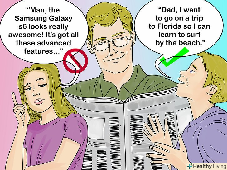 Не кажіть натяками.ви не досягнете гарантованого успіху, якщо будете висловлюватися узагальненими фразами наступної конструкції: “подивіться, як же круто виглядає Samsung Galaxy s7! Скільки у нього нових функцій... " ймовірно, ваші батьки просто не зрозуміють натяку, або зрозуміють, але нічого не дадуть. І в тому, і в іншому випадку ви не отримаєте бажаного. Пояснюйте прямо, чого ви хочете.[2]- Прикладом прямого звернення може послужити наступна фраза:"тато, я хочу поїхати до моря, щоб навчитися серфінгу". Також корисно підкріпити своє прохання який-небудь проактивною метою. Наприклад, так: "Мам, мені дуже потрібен ноутбук, щоб я міг більше програмувати і вчився створювати веб-сайти. Так я зможу краще підготуватися до вступу в Інститут".
