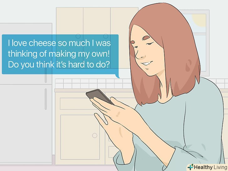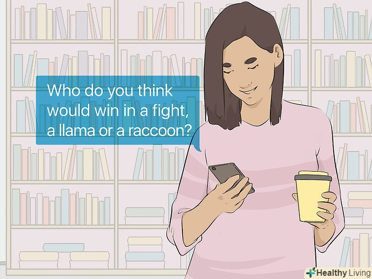 Почніть з випадкової теми, якщо хочете показати свою грайливу сторону.якщо, як правило, ви ведете себе нерозумно і непередбачувано, не бійтеся повідомити про це людині з самого початку! Наступного разу, коли у вас виникне абсолютно нестандартна думка, поділіться нею з предметом обожнювання в листуванні. Якщо він підхопить її, можливо, ваші характери непогано Сумісні![4]- Наприклад, можна сказати: "я так люблю сир, що подумую виготовити власний сорт! Як думаєш, це складно?"- або: "як думаєш, хто переможе в бою: лама або єнот?»